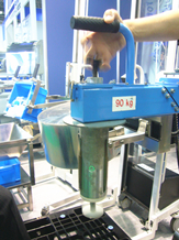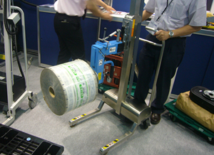 ラベルなどのロール材を対象とした内径クランプリフター、90度反転機能付き、既存台車に装着可能です。