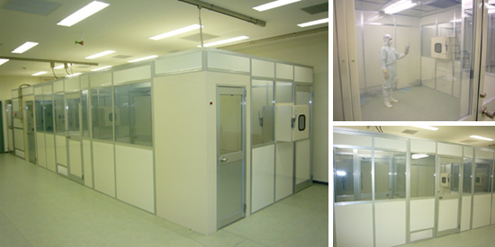*アルミフレ-ムは独自設計の自社製品。板を両面張りにすることで面フラット化を実現。様々な形状に対応し、設置後の拡張・縮小工事が容易にできます。空調機にはSUS製FFUファンユニットを使用し、HEPAフィルタ-も内製品です。エアシャワ-、パスボックスは鋼板プレス、塗装工程を一貫製造することで低価格化を実現します。