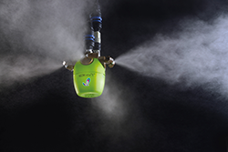 ものに当たっても濡れない霧。見た目は霧というより煙です。特許ノズルAKIJet®により非常に細かく、均等な霧を大量に発生します。