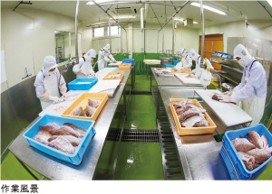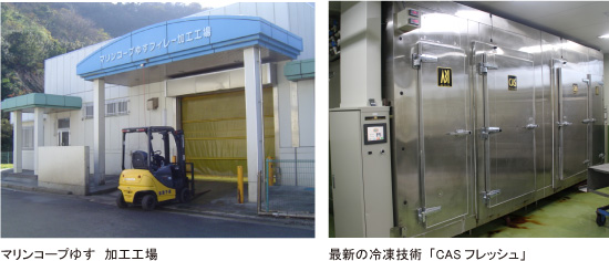 加工部 部長 山下様… FSSC22000の認証を受けた安心・安全な加工場でフィーレや切り身などの加工を行っています。最新の冷凍技術「CASフレッシュ」も導入しています。細胞を破壊することなく凍結し、香り、旨味、みずみずしさを閉じ込めたフィーレや切り身を全国に出荷しています。