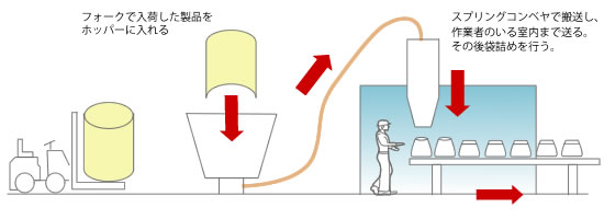 お客様の現場では、粉体製品が受け入れホッパーからフレキシブルスクリューコンベヤで高さ約4mまで搬送され、その下の袋詰め・仕分け工程へ移動します。