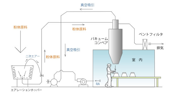 今回は、バキュームコンベヤ・エアレーションホッパーを使用した複合的な装置への変更と改善を提案しました。