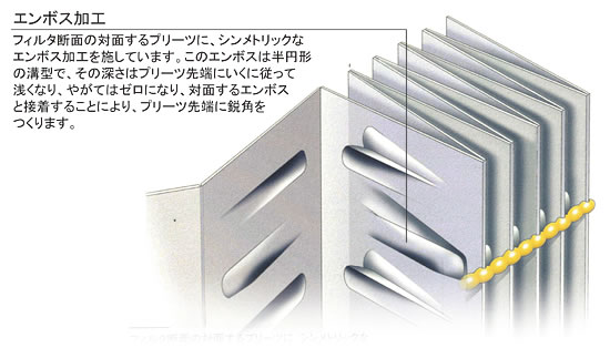 - 廃棄は、アルミセパレーターなどを使用していないため、ろ材からセパレーターや枠を外す手間が無くそのまま処理できます。*早期圧力損失上昇の原因であるろ材どうしの密着を防止するため凹凸のエンボス加工し、セパレーターを使用せず、プリーツを多く取る事が可能になり濾過面積を多く取れ初期圧力損失を最大40%も低減できます。*圧力損失が少ないため、消費電力の低減にもつながります。