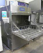 洗浄からすすぎまで自動で行なう器具洗浄機をご提案。デモ機で実際の効果を確認していただきました。