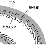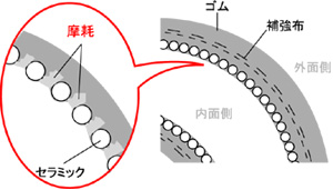イラストの通り、セラミックホースはゴムホースの内径面にφ2~3の球を並べて製作されており、曲がりの外側部のセラミック球の間隔が空き、その部分の耐摩耗性が低下し穴が空いてしまいます。一方セラミックスリーブホースは曲げても、セラミックスリーブがスライドすることでゴム部が表面に露出しない構造で耐摩耗性を維持する事が出来ます。