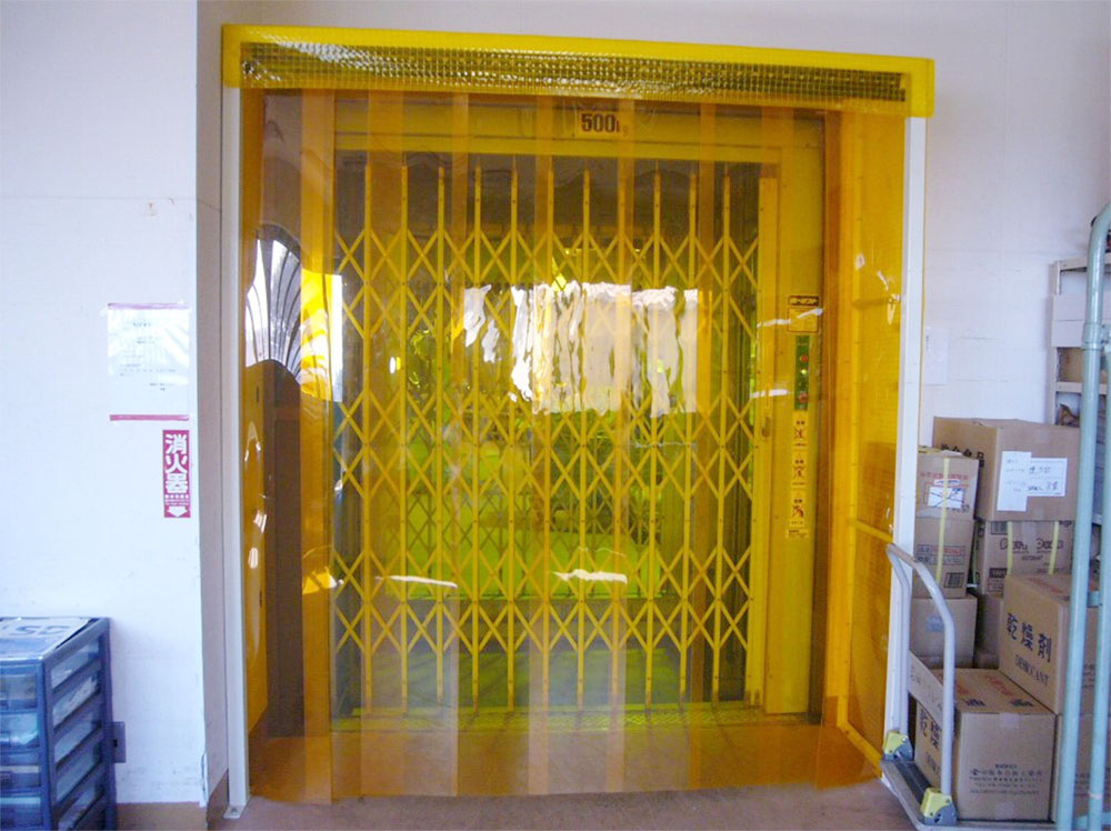 - 資材搬入用エレベーターのアコーデオンカーテンの前に、自閉式スリットカーテン(防虫色)を設置。