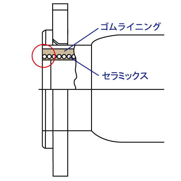 接続部のゴムライニング部にセラミックリングを挿入(下図参照)、流入口での搬送物とゴムライニング部の接触を防止。
