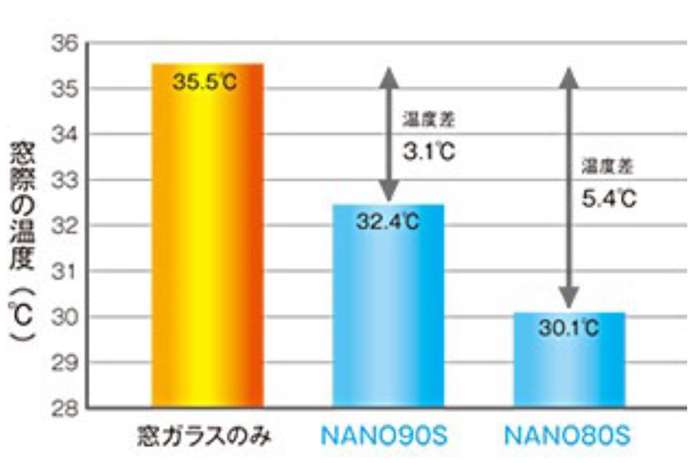 - 窓ガラスからの熱線(赤外線)侵入を90%以上カットし、窓際の温度が最大で-5.4℃