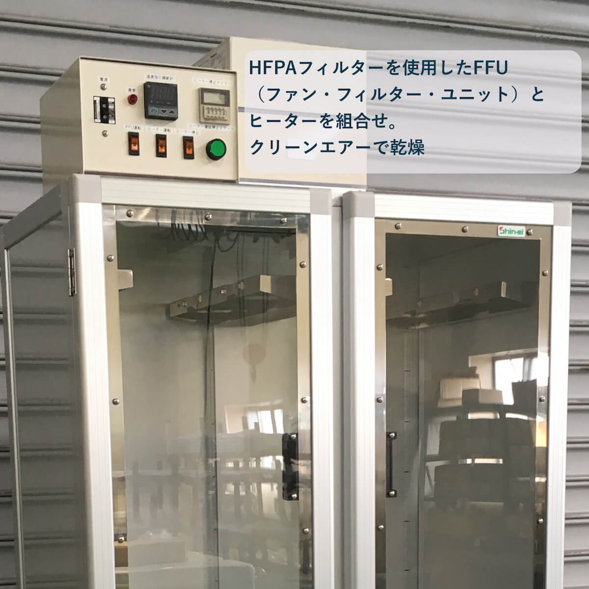 - HEPAフィルターを使用したFFU(ファン・フィルター・ユニット)とヒーターを組み合わせ、クリーンエアーで乾燥。