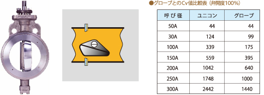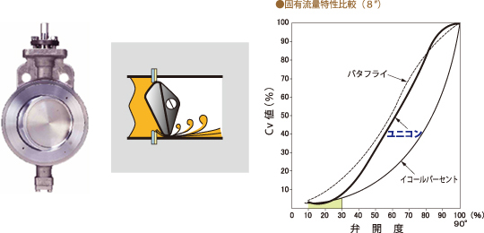 NBSユニコンは、一般的なバタ弁では難しい流量コントロールをする為に作られた特殊なバタフライバルブです。
