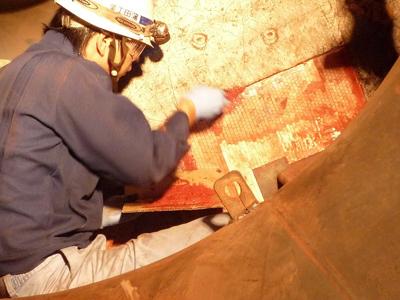 すでに送風機メーカー様でライニングされていたものが、操業で剥がれその部分の補修工事です。