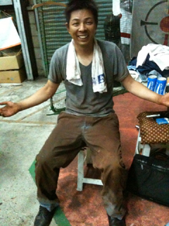 青色のズボンが粉じんで汚れてこんな感じ。作業した10人全員がこの様に汗と埃だらけです。