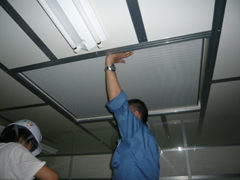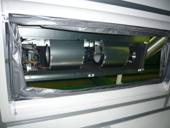 クリーブース内からみるエアコンの送風口。ヘパフィルターをつけて、