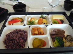日本の味噌汁や漬物に韓国のキムチ、洋風のデザート、一つのお弁当箱に多国籍料理が沢山入っていました。とても美味しかったです(*^_^*)