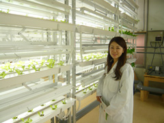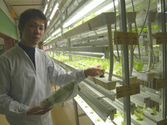 1つのユニットに320株の野菜の苗が植えられていて、成長に応じて蛍光灯の高さを調整します。