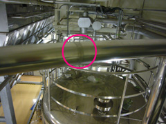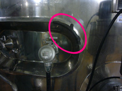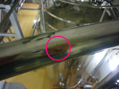 写真のようにタンクにひび割れが発生し、臨時対応として補修剤を貼りつけてありました。