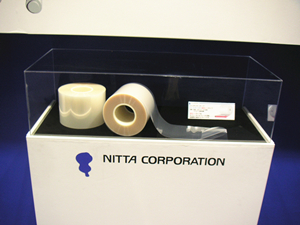 特殊なポリマーを使用した温度変化に対して「粘着」⇔「非粘着」を繰り返す新しいタイプの粘着テープを出展されていました。「クールオフ」機材を冷やすと剝がれるものと「ウォームオフ」機材を温めると剝がれるものがあります。