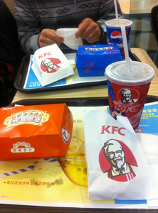 昼食に食べたケンタッキーフライドチキンにて、セットで38元(約530円)日本とあまり変わらない価格です。