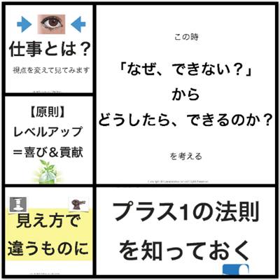 どんな普通のことでも、プラス1の法則を加えますと、必ず他人と差別化ができると思います。つまらない仕事でもプラス1の姿勢でやりますと、面白くすることもできます。