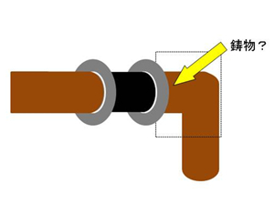 また、例え溶接できても、片側の配管は鋳物製のようでした。鋳物に溶接するのは鋼管に溶接するのに比べ、結構時間がかかるので、施工時間が長くなる心配がありました。幸い配管は複合構造 (L部分のみ鋳物で、接続する単管は鋼管です) になっていました。(^^)。