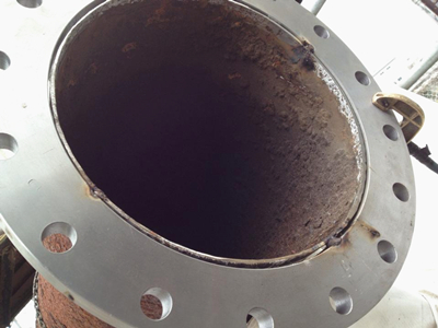 先ほども言ったように、切断するのはすごくリスクが高いですが、何とか補修可能な状態でして、作業開始直後はラッキーだと喜びました。が、作業を進めていくと配管内径側の錆はかなりひどく、最大5~6mmのクリアランスを溶接し、それから2時間かけてバリ取りをしました(^_^;)。
