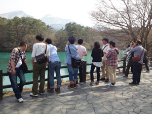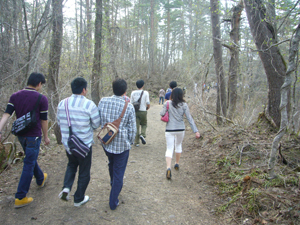 バスガイドさんに「天気が良いから、歩きながら五色沼の景色を見たほうがいいですよ」と勧められ、1班全員は4kmのハイキングコースを歩きました。