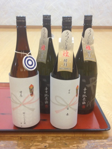 (2年前の創業90周年の時記念品として使わせて頂いた「花春酒造」3本と、日本政策金融公庫の福島支店様から頂いたお酒1本)
