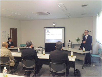社長から当社の経営理念、沿革について「TOPからのメッセージ」と題しスピーチ。