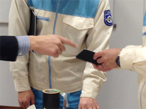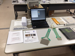 圧力分布測定システムであるタクタイルセンサーは小松主任が実演しながら説明。