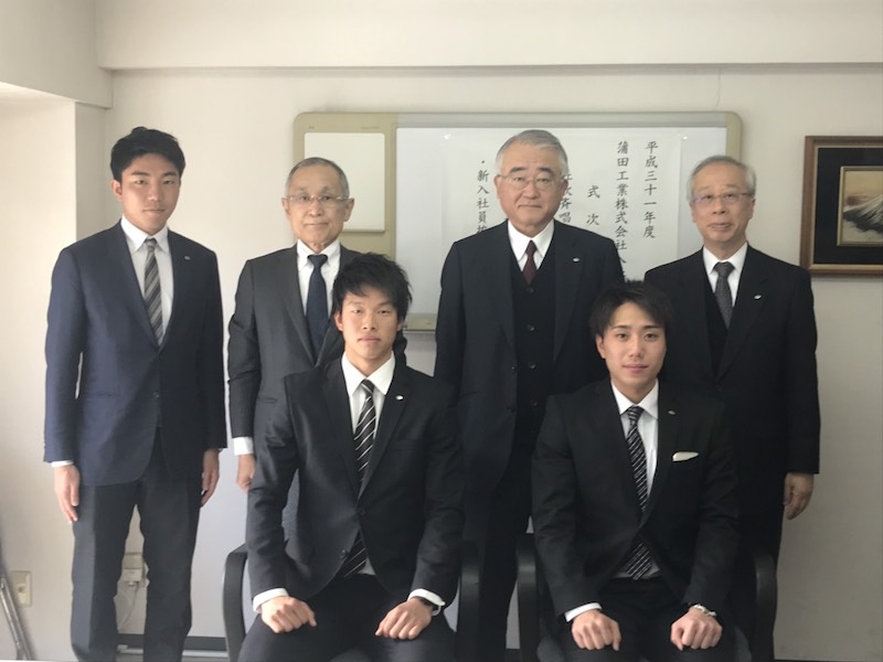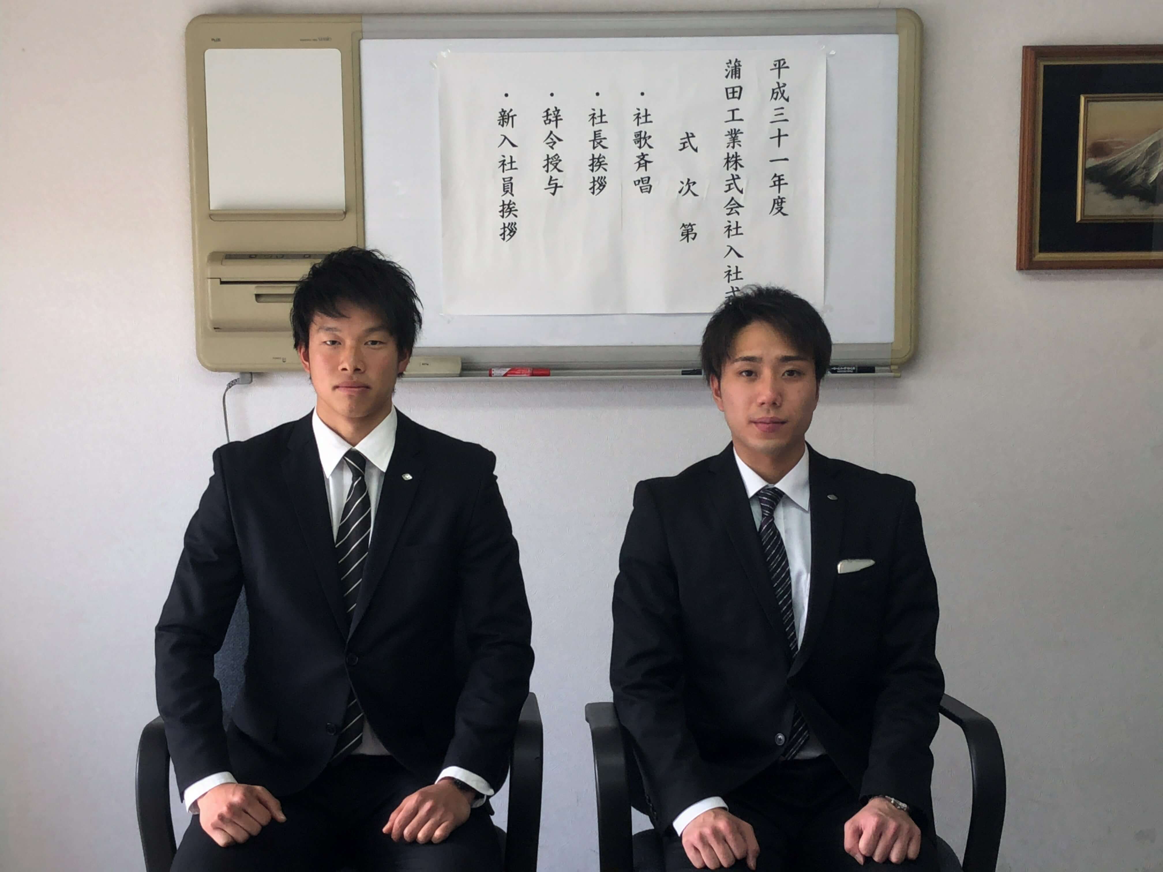 4月1日、蒲田工業本社にて入社式を開催いたしました。第二新卒として入社した山嵜隆治くんと、新入社員として入社した大谷吉広くんをお迎えしました。