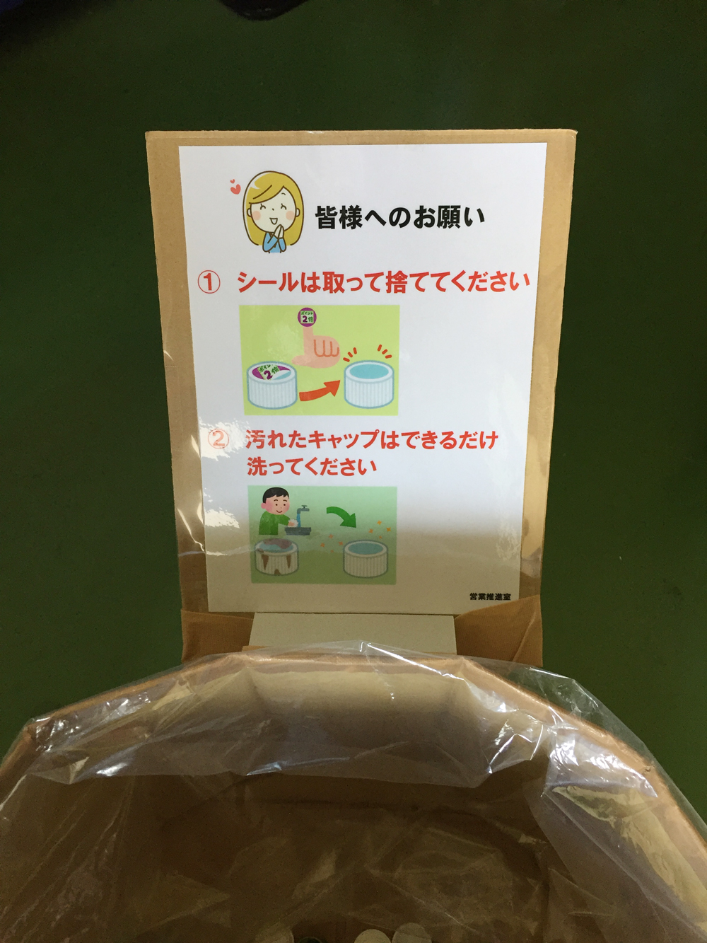 今まで、社員の皆様「シールが貼ったままで捨てるのはNG」シールが貼ったままで捨てるのはNG」を伝えてなかったので、これから協力してもらいます。