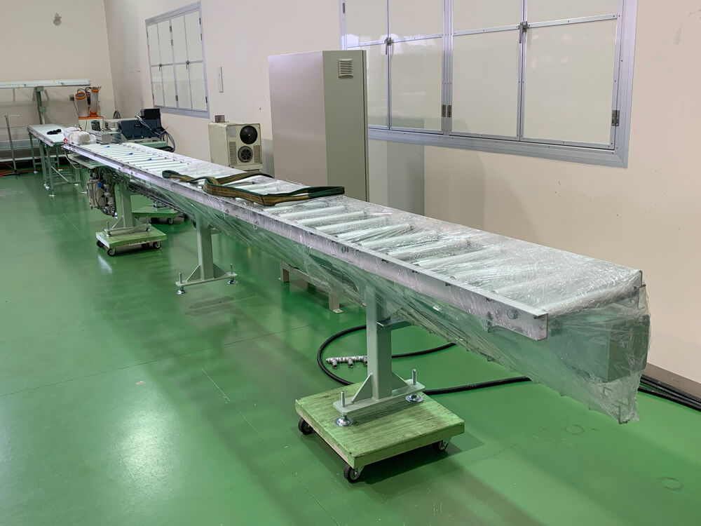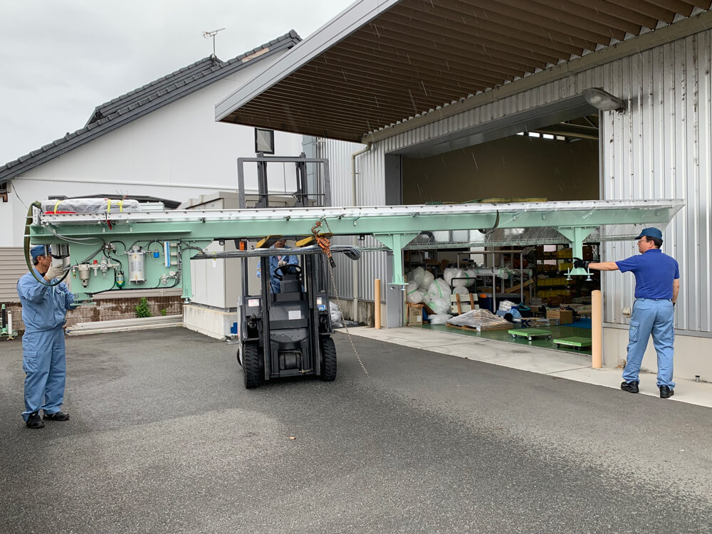 【アルミ切断・穴あけ装置】は細長いため、搬入作業は苦労すると思われましたが、弊社の工場で日常的に取組む5S活動によって入口付近には障害物がなく、搬入作業はスムーズに進行しました。