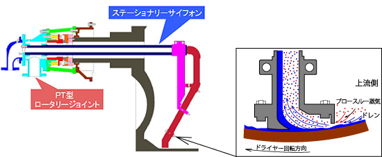 抄紙機ドライヤーのサイフォンは、接続配管を付けた装置で、これによってドレン(コンデンセート)・ブロースルー蒸気ならびに非凝縮ガスをシリンダードライヤーの中から排出する装置。ドレンの流れを作り出す為には、蒸気の供給口と排出口との間に差圧(△P)が必要ですが、最近の高速マシンでは低差圧でドレンを排出することが出来ます。