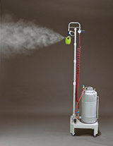ものに当たっても濡れない霧。見た目は霧というより煙です。特許ノズルAKIJet®により非常に細かく、均等な霧を大量に発生します。