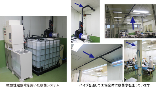 蒲田工業 村上… 何より殺菌効果と安全性の高さを重視して選定しました。今回導入頂いたシステムには次亜塩素酸という新たに認可された食品添加物を用いています。次亜塩素酸ナトリウムの約80倍という殺菌効果を持ちながら、安全性も高いという特長を持っています。