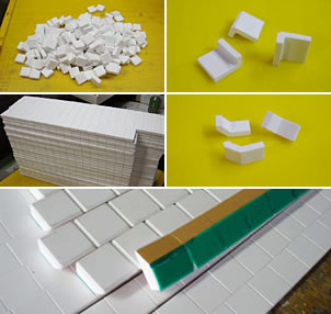 また、セラミックスは型で成型し焼結するため、規格化された製品を使用(応用)することがコストパフォーマンス上必要不可欠です。そこで一般的によく使用されるタイルチップがあります。タイルは、加工性の難しさを克服でき応用範囲も広くお客様の多様なニーズにお応えすることが可能です。現在、タイルの接着方法は、樹脂系接着剤を用いて施工されるケースが一般的です。